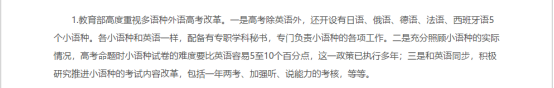 与此同时,教育部在《教提案[2018]第190号,关于政协十三届全国委员会第一次会议第0013号(教育类006号)提案答复的函》中明确指出:“教育部高度重视多种外语高考改革,充分照顾小语种的实际情况,高考命题时小语种的试卷难度要比英语容易5至10个百分点。”